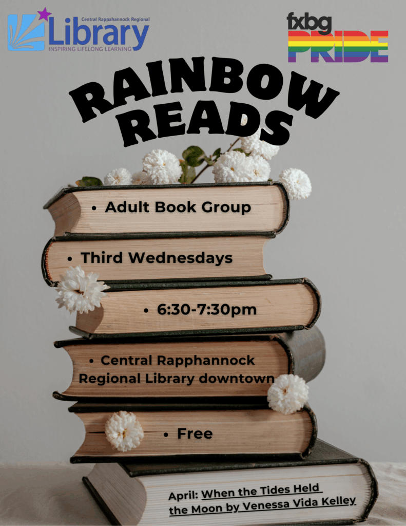 An LGBTQ+ and allies book group. In partnership with FXBG Pride and Central Rappahannock Regional Library