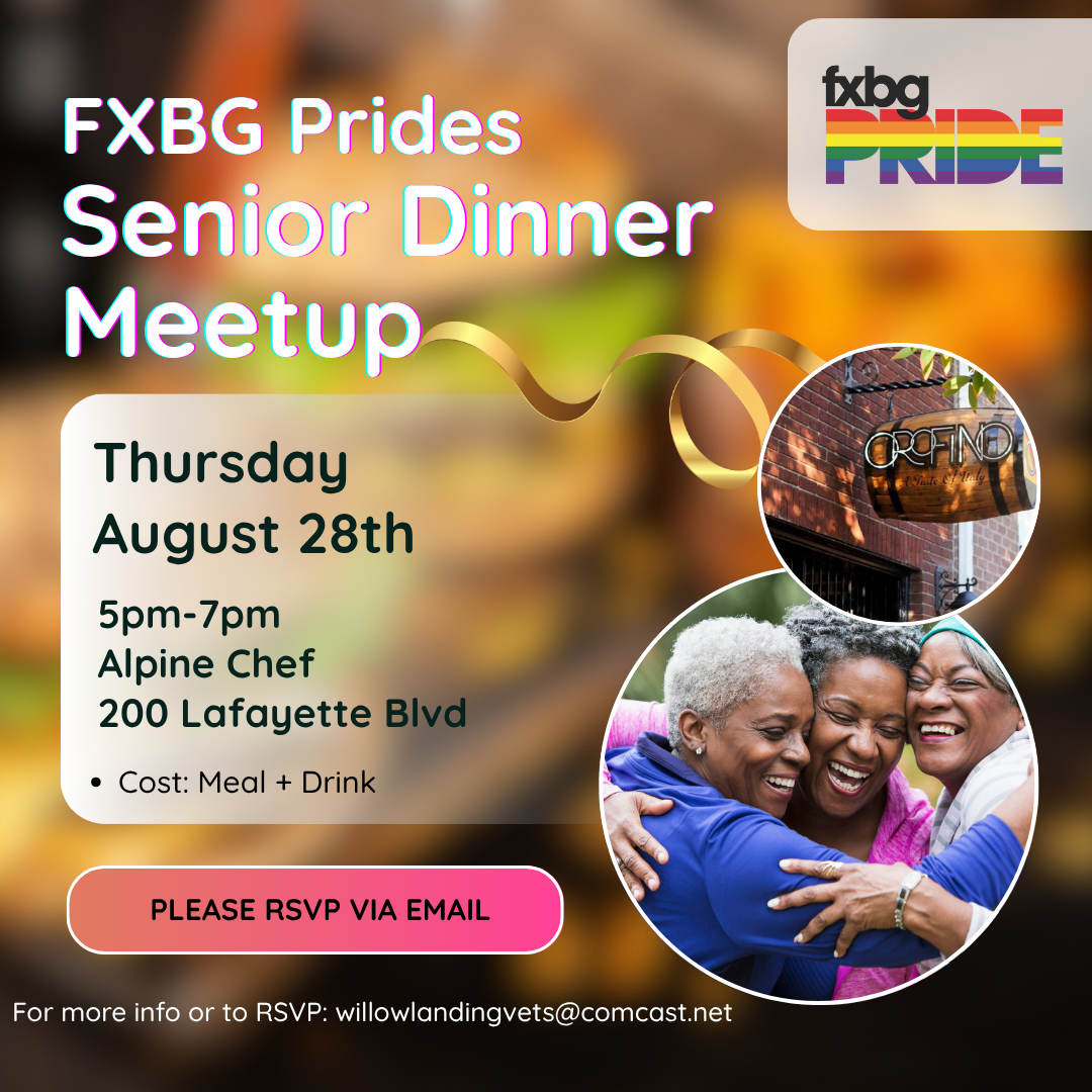 Fredericksburg Pride is hosting our Senior Dinner night at Alpine Chef When: Thursday August 28thTime: 5pm-7pmLocation: Alpine Chef, 200 Lafayette BLVD, Fredericksburg, VA 22401Menu: https://www.alpinechefrestaurant.com/menusCost to attend: Meal and Drink Accessibility: The Alpine Chef is wheelchair accessible and we will be sitting at a table - most likely inside. FXBG Pride Senior Dinner Meetup typically meets […]