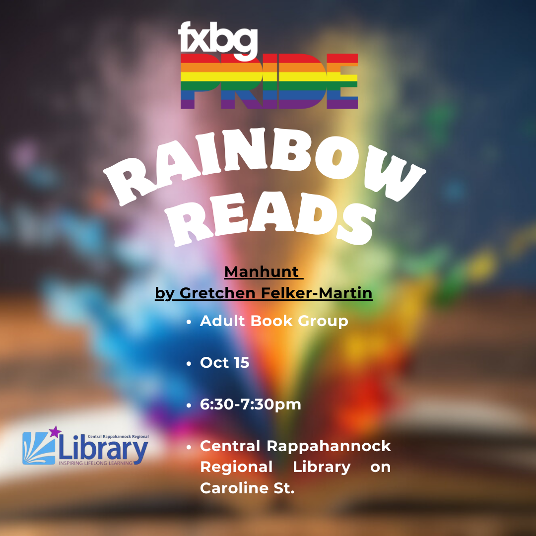Rainbow Reads: Manhunt by Gretchen Felker-Martin An LGBTQ+ and allies book group. In partnership with FXBG Pride and Central Rappahannock Regional Library Suitable for: Adults Alt Photo Description: A background of a blurred book with rainbow exploding out of it. Text reads: Rainbow Reads, Manhunt by Gretchen Felker-Martin, Adult Book Group, Oct 15, 6:30-7:30, Central […]
